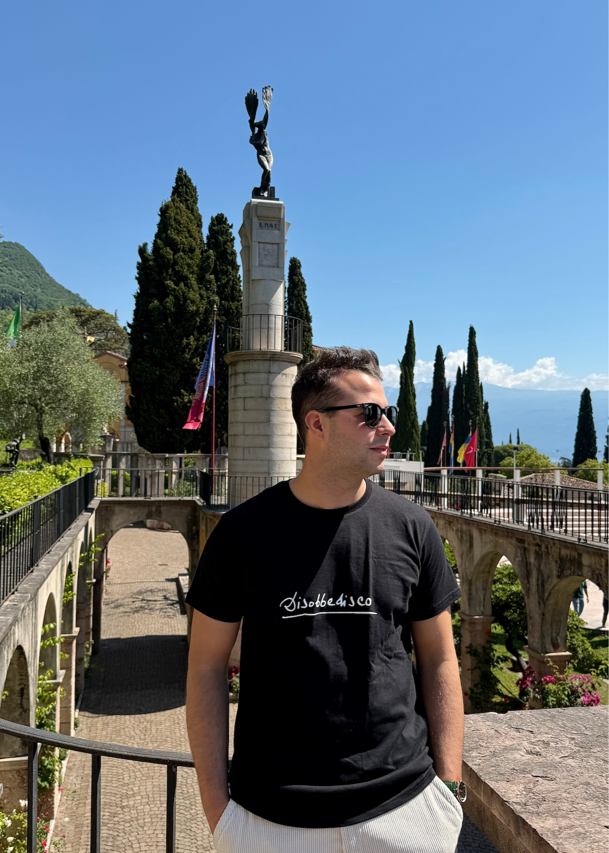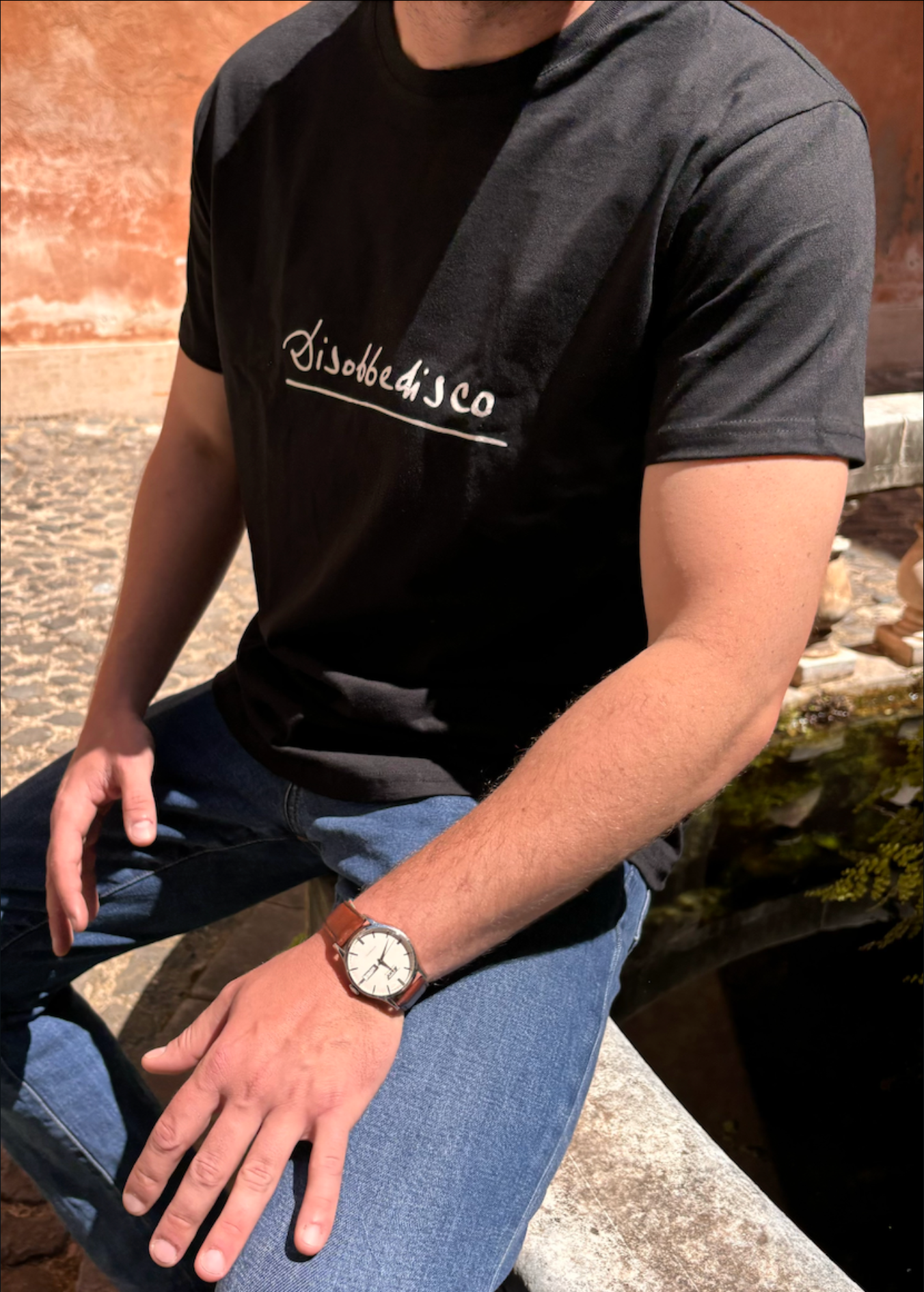 Maglietta nera casual con motto dannunziano DISOBBEDISCO